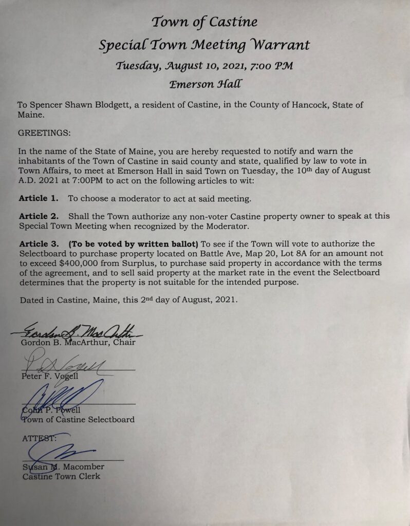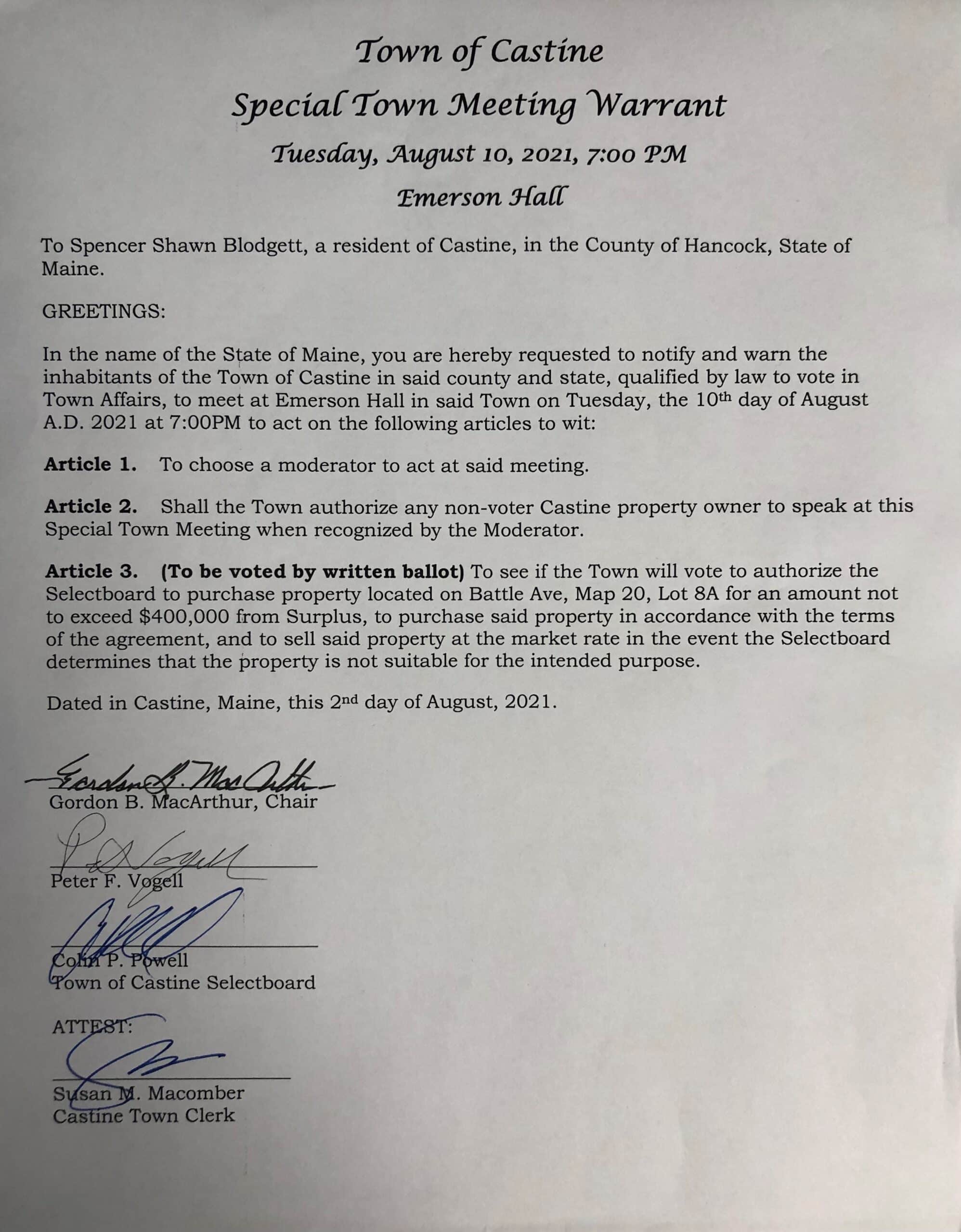 August 10, 2021 Special Town Mtg WARRANT