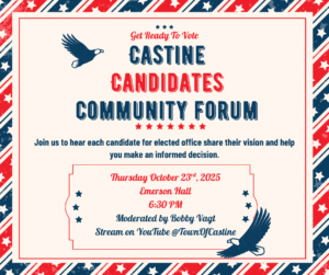 - Castine Candidates Community Forum: Thursday, 10/23/25 at 6:30PM in upstairs Emerson Hall; Sponsored by Castine Citizens.